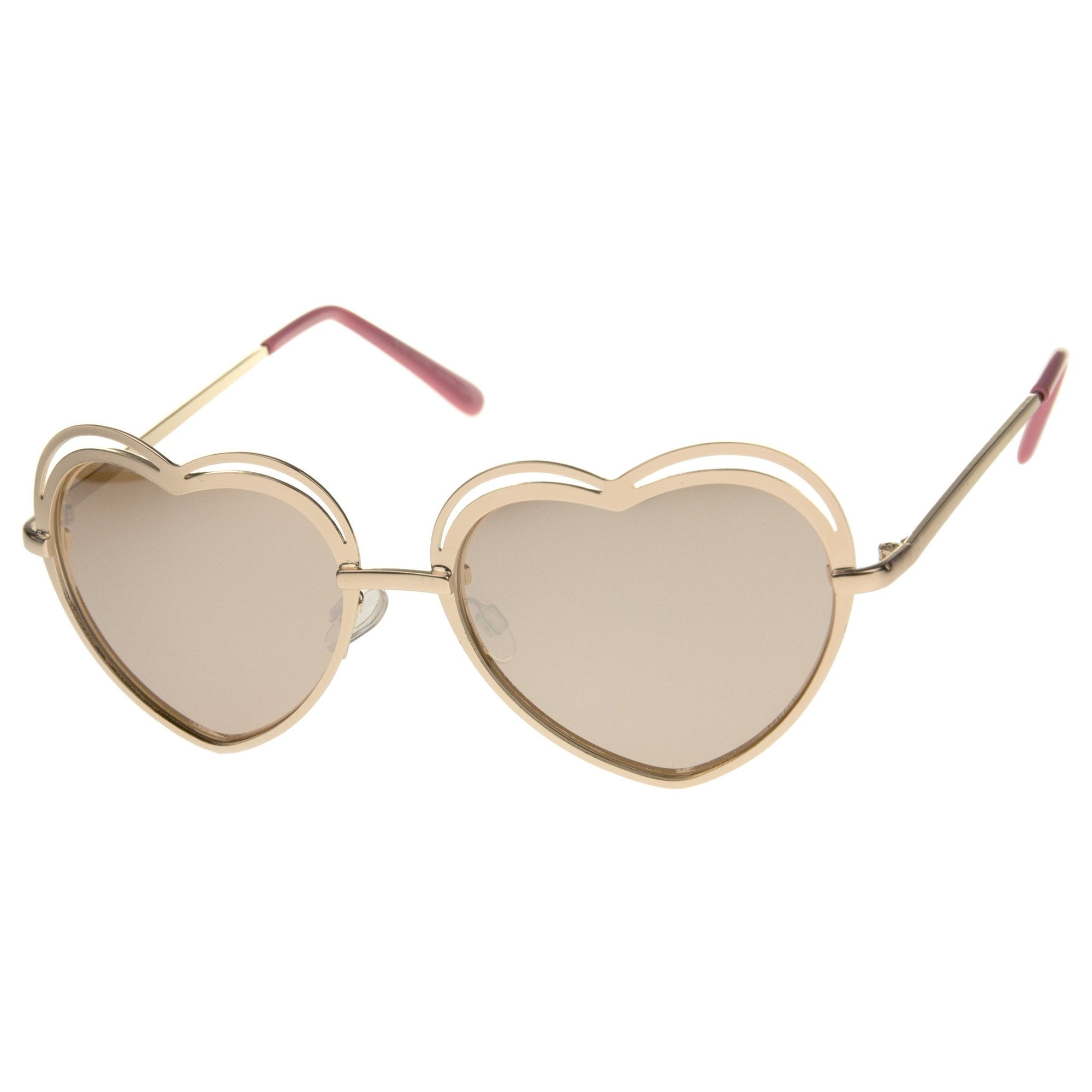 • Complete your sweet outfit with these darling heart-shaped sunglasses featuring a full metal frame with unique cutouts at the top. A metal nose bridge and stylishly slim metal temples finish off this flirty and playful style. We ensure you'll be loving these heart sunglasses as much as we do. Made with a metal based frame, English style nose pieces, metal hinges, and polycarbonate UV400 lenses.