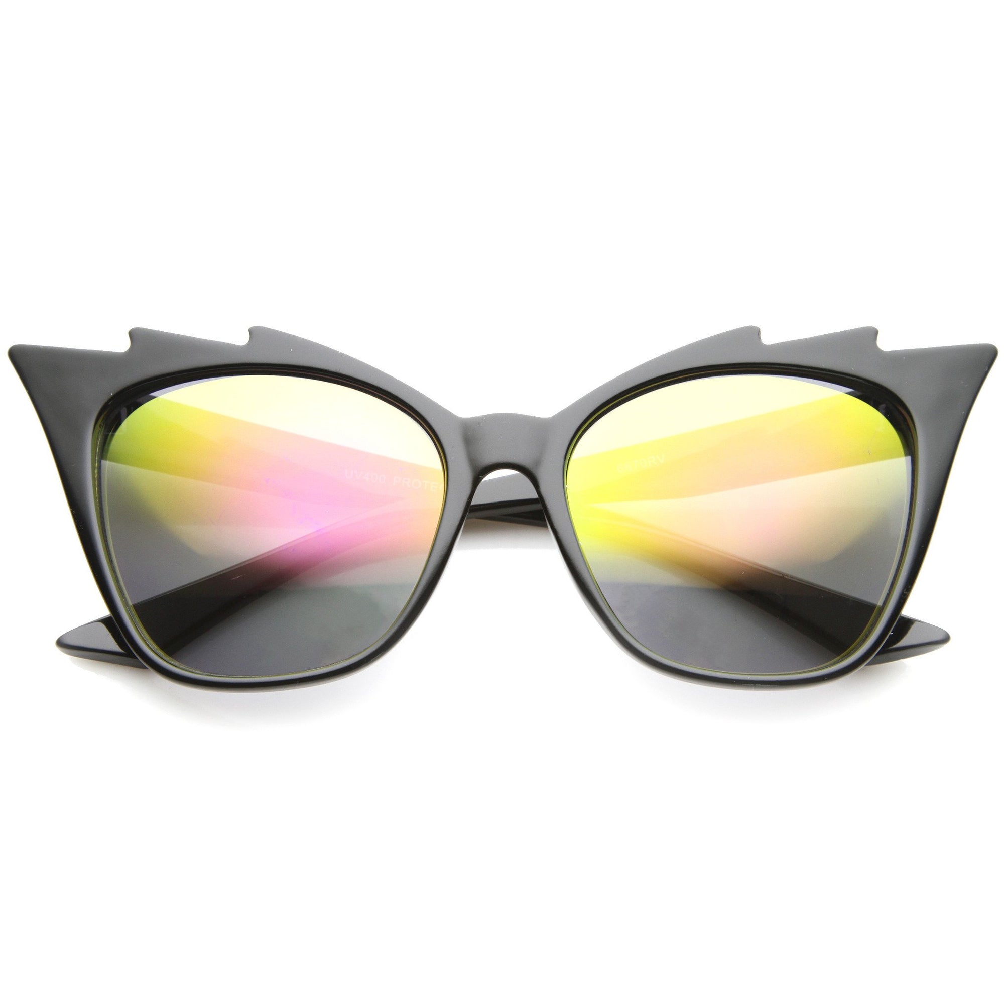 • These sassy sunnies have a glam-rock edge with jagged cat-eye frames and feature vibrant flash mirrored lenses. The staggered points cascading to the outer corners of the oversized frame create a cat-eye silhouette almost out of thin air. Perfect for someone searching for sunnies that are fun and eccentric this season! Made with plastic based frame, reinforced metal hinges and mirrored UV400 protected polycarbonate lenses.