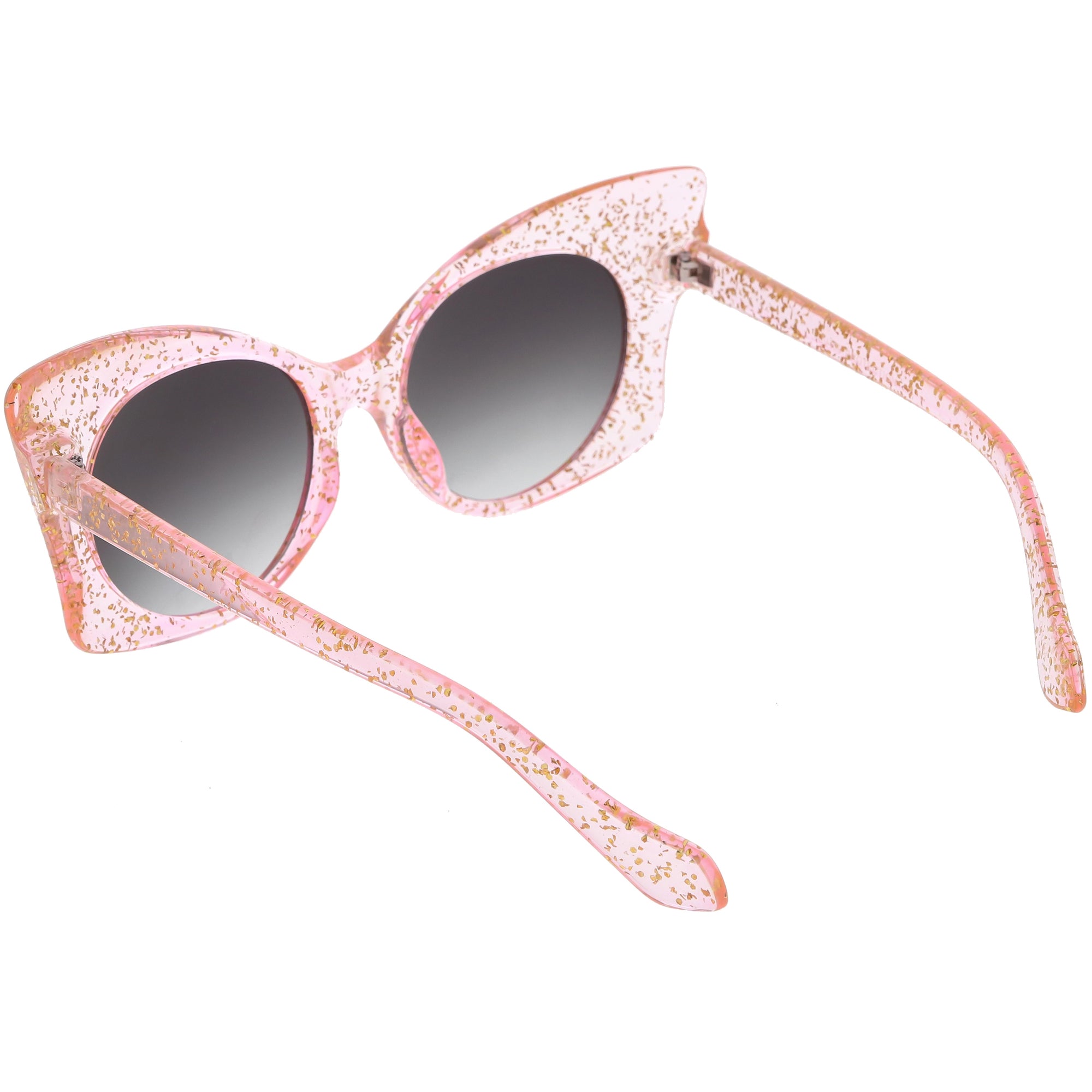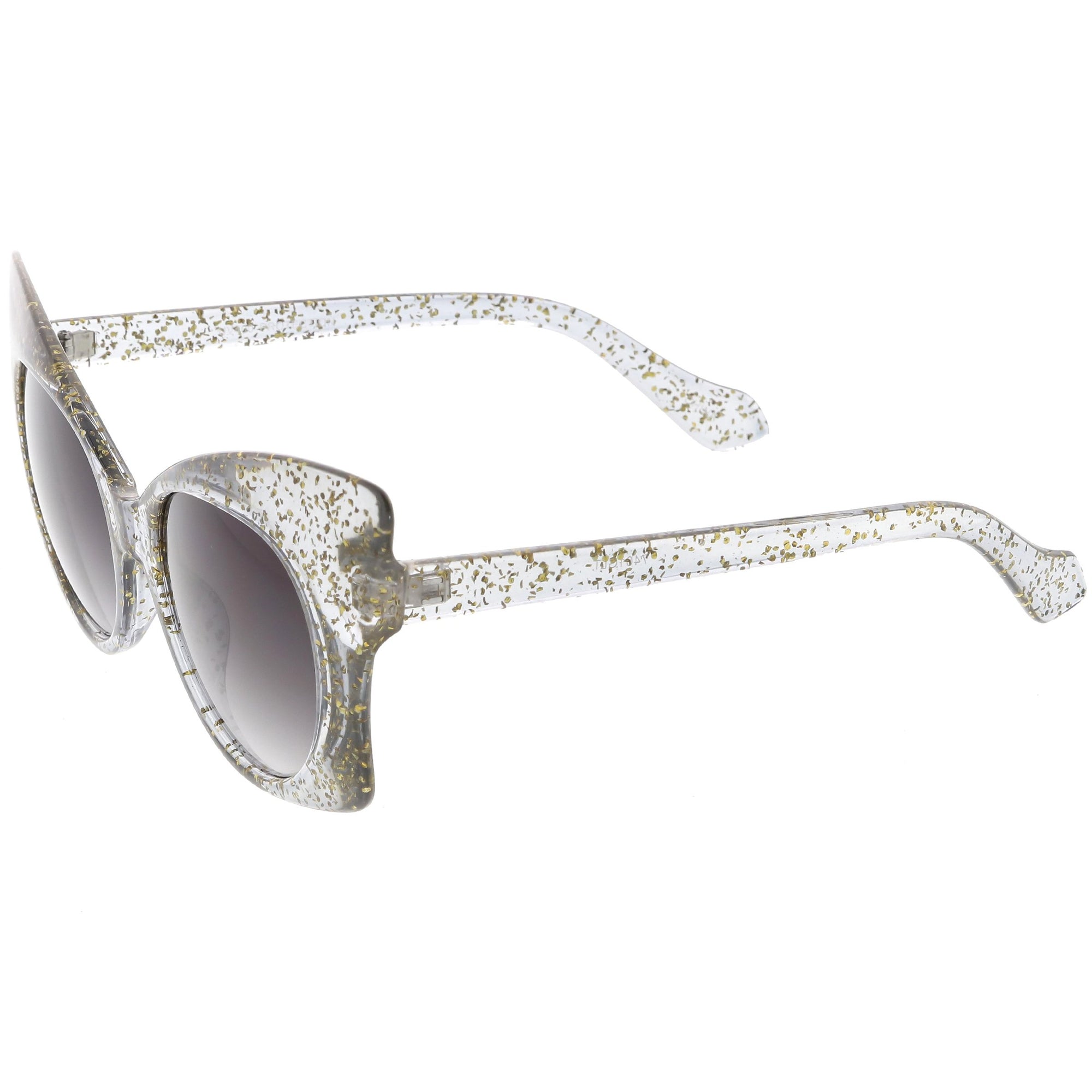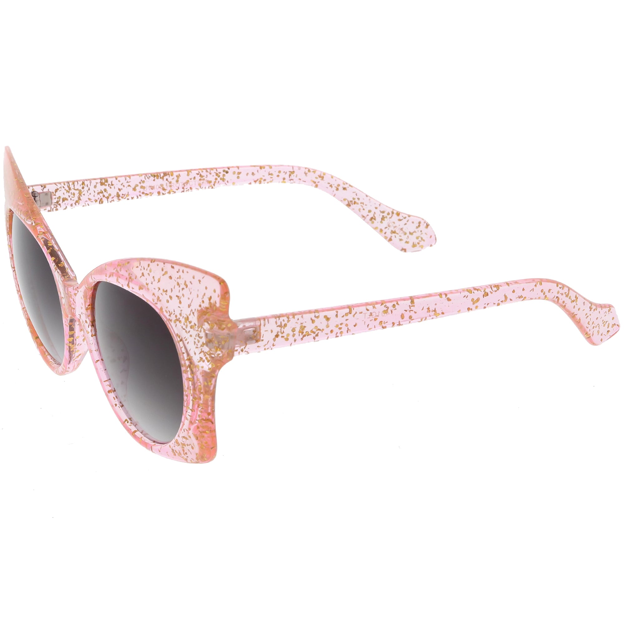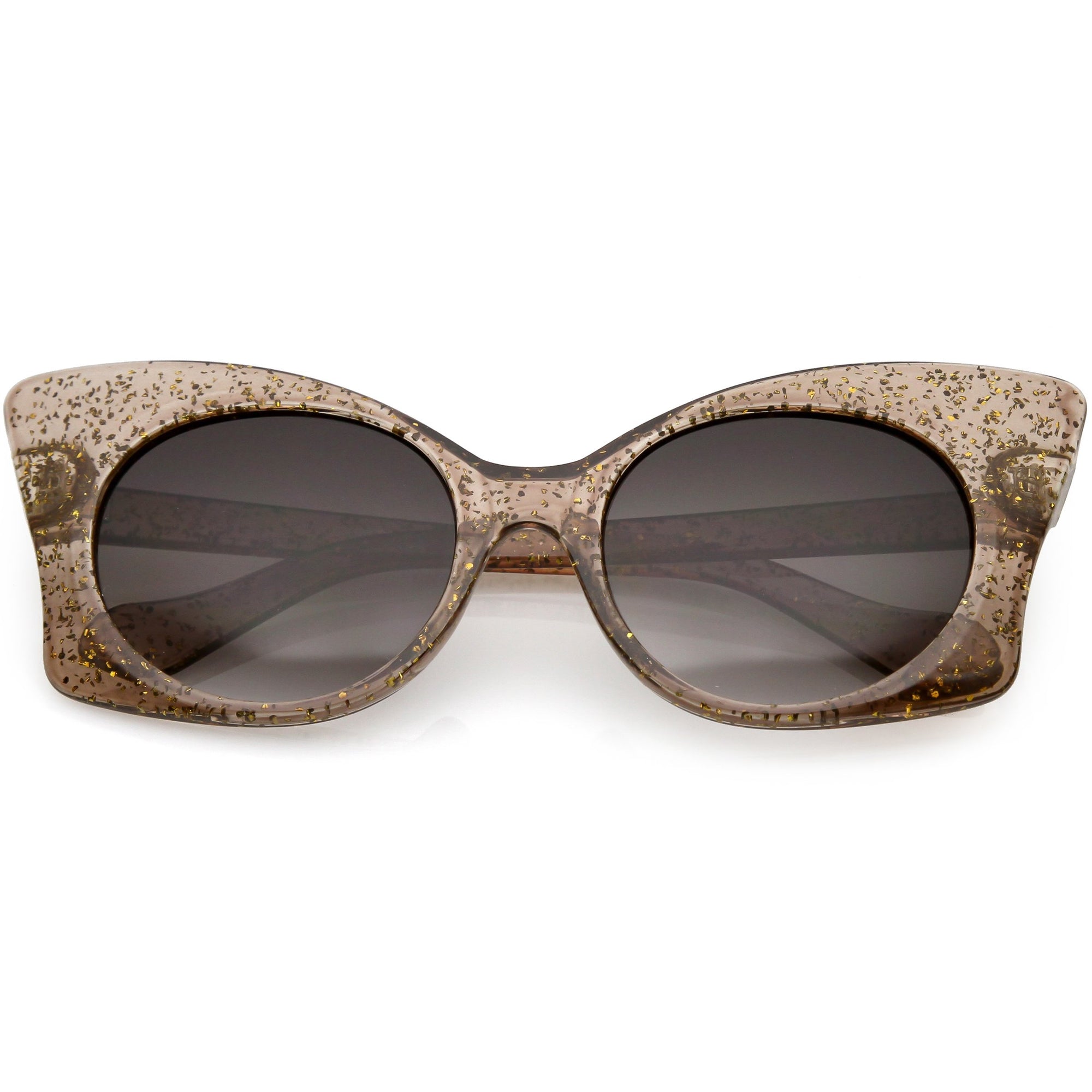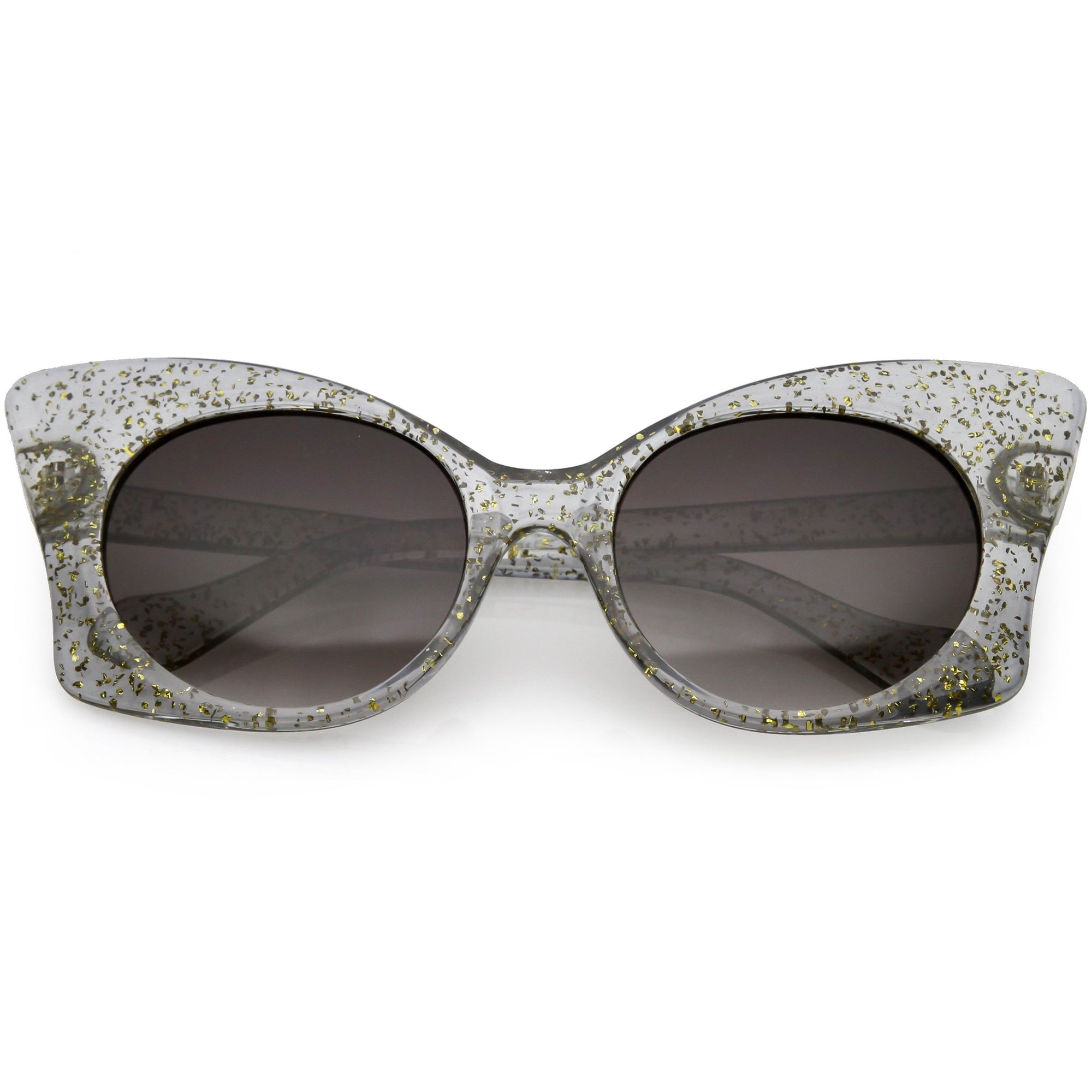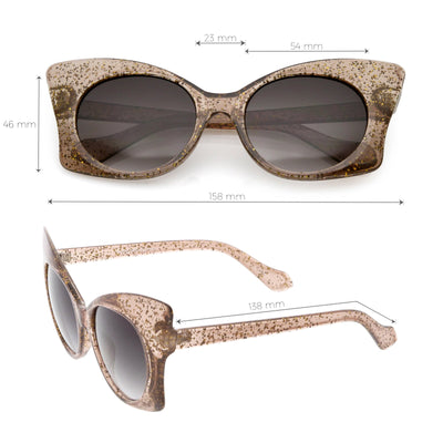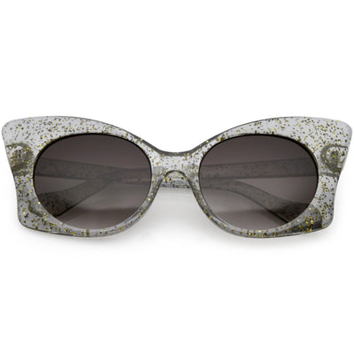 Whimsical and fun, these oversize butterfly sunglasses are designed with a translucent glitter frame with contrasting neutral colored round lenses. Sparkly and unique, these glitter butterfly sunglasses add a playful touch to your look. Made with a plastic based frame, reinforced metal hinges, and 100% UV protected lenses.