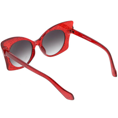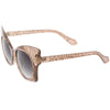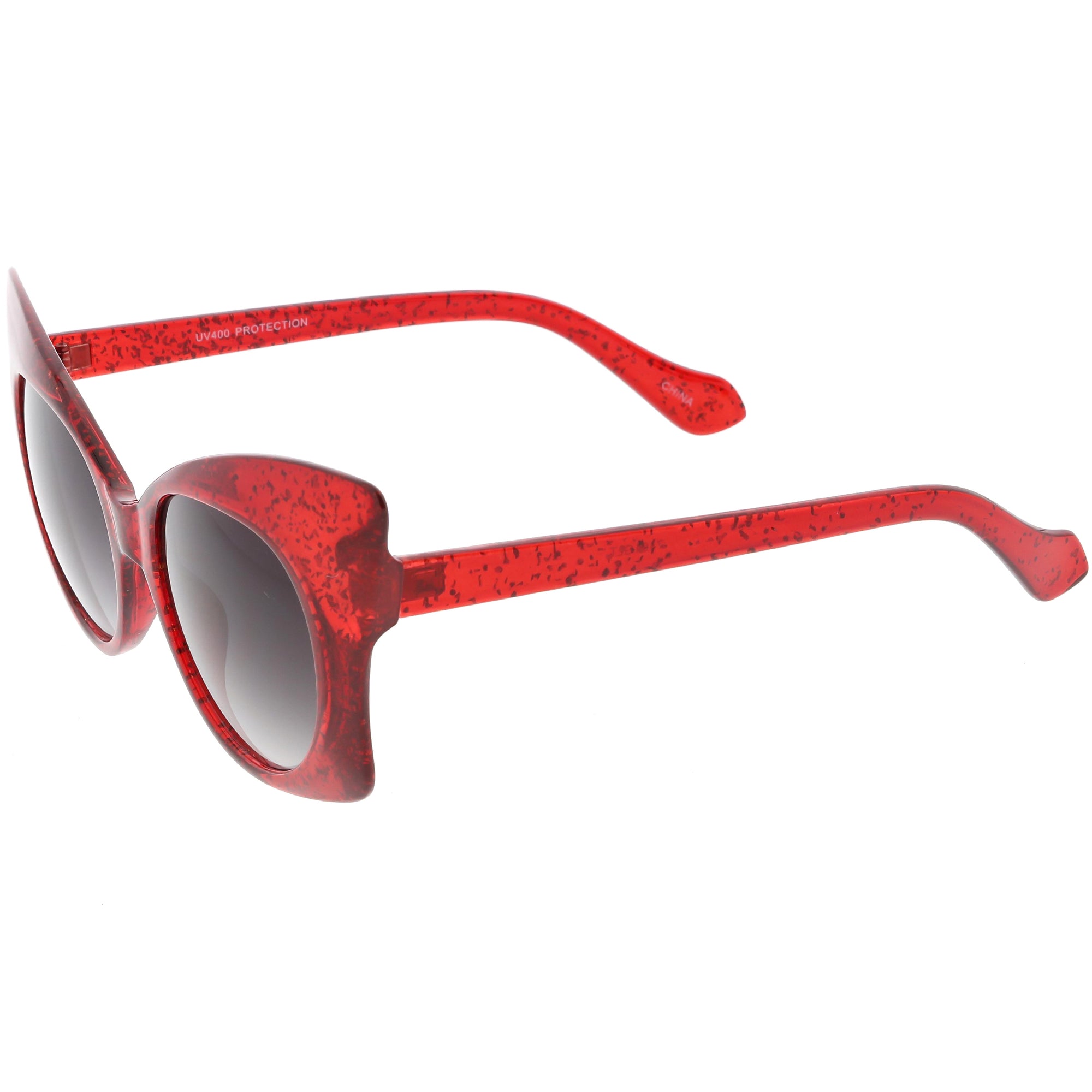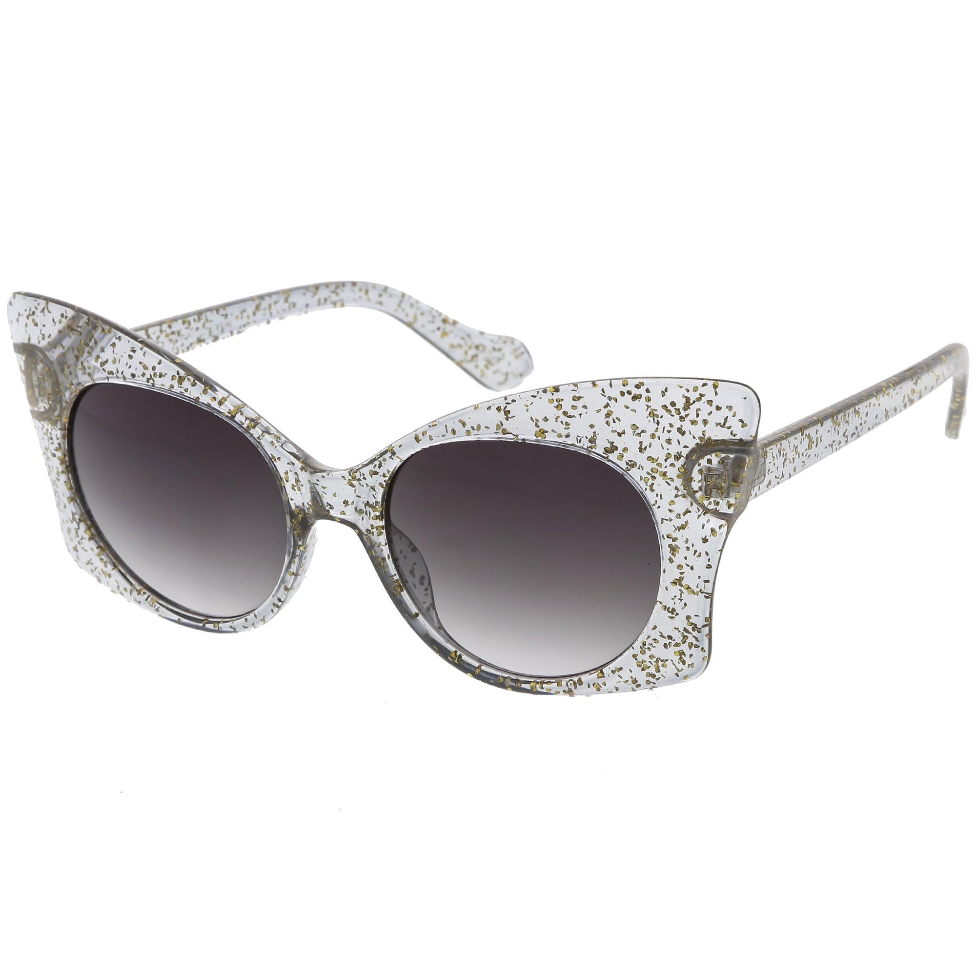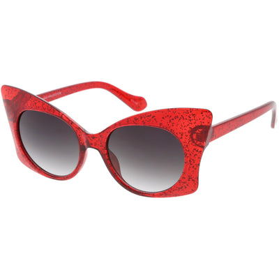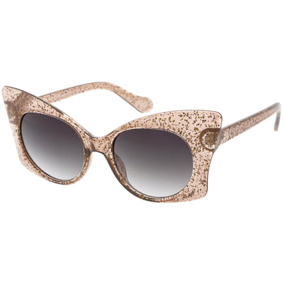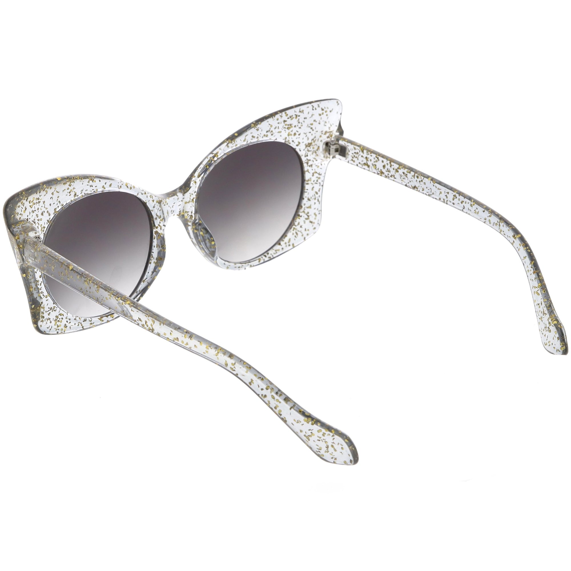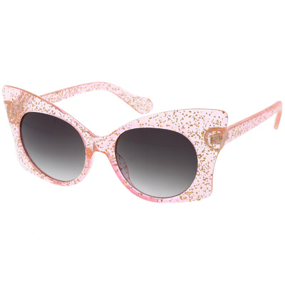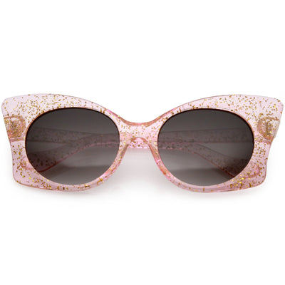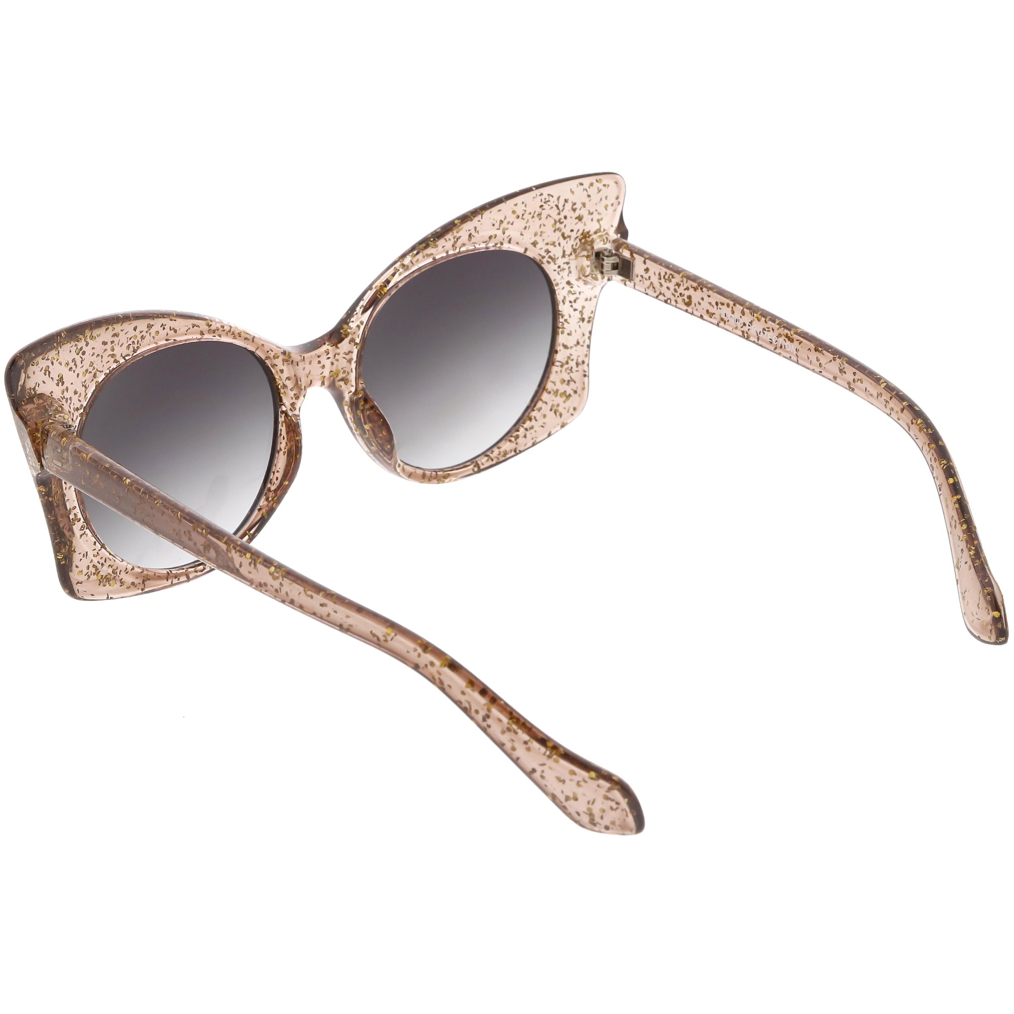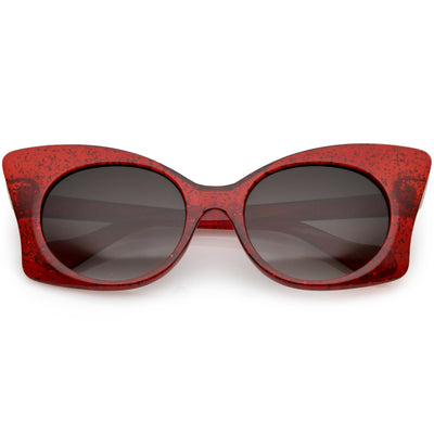 Whimsical and fun, these oversize butterfly sunglasses are designed with a translucent glitter frame with contrasting neutral colored round lenses. Sparkly and unique, these glitter butterfly sunglasses add a playful touch to your look. Made with a plastic based frame, reinforced metal hinges, and 100% UV protected lenses.