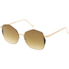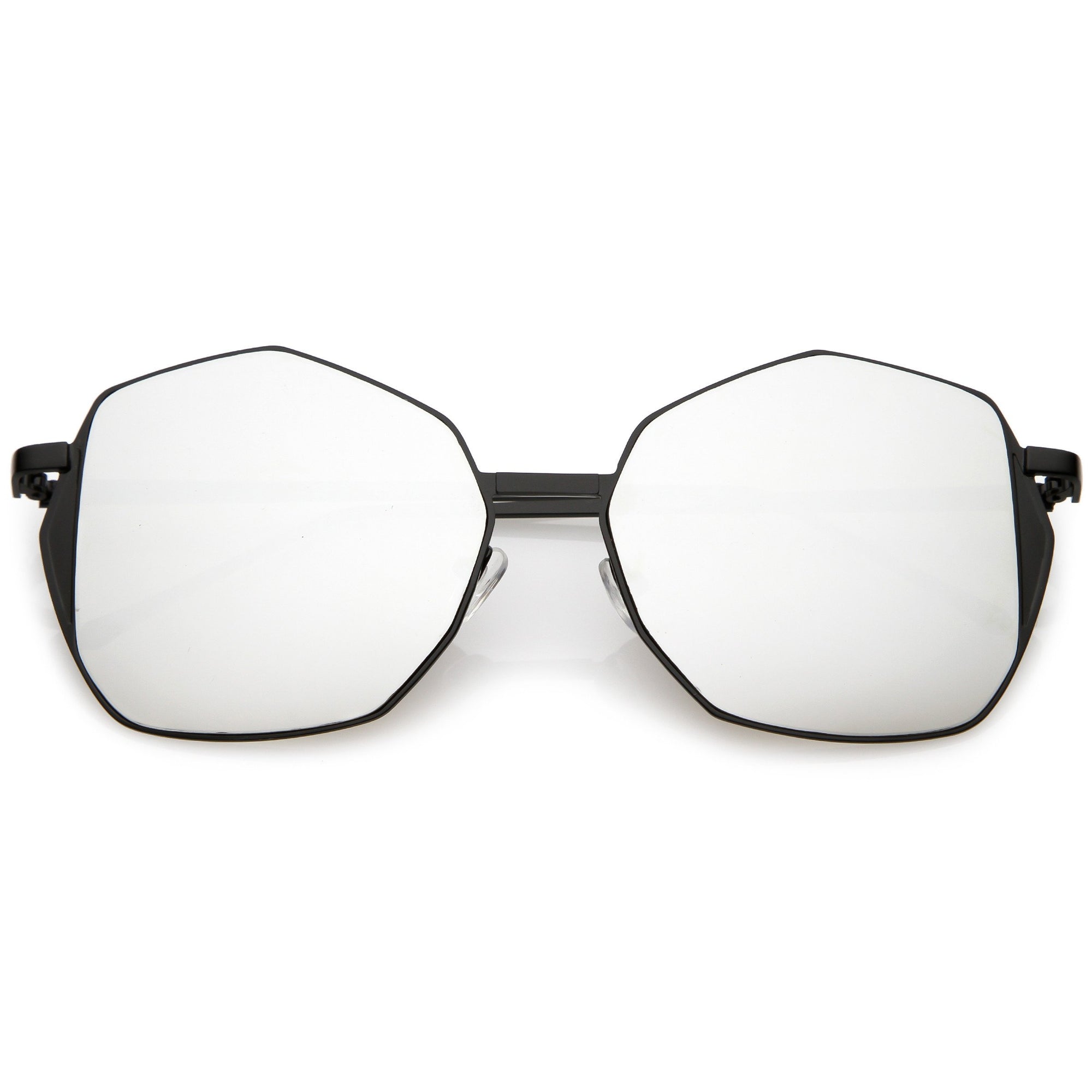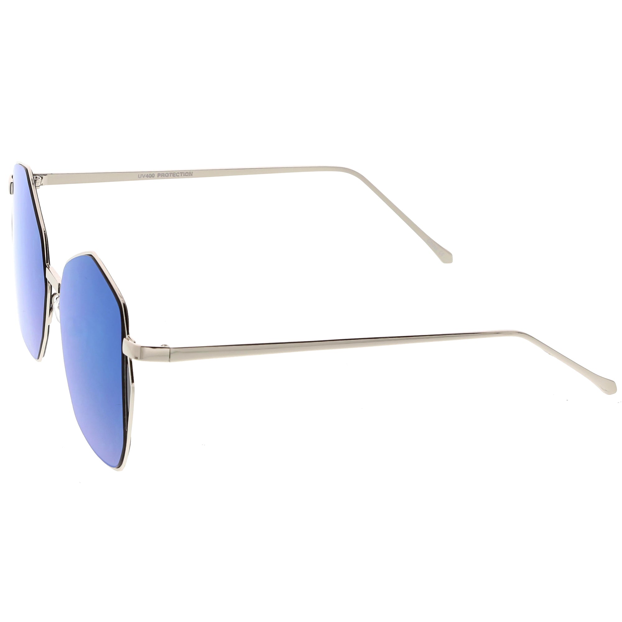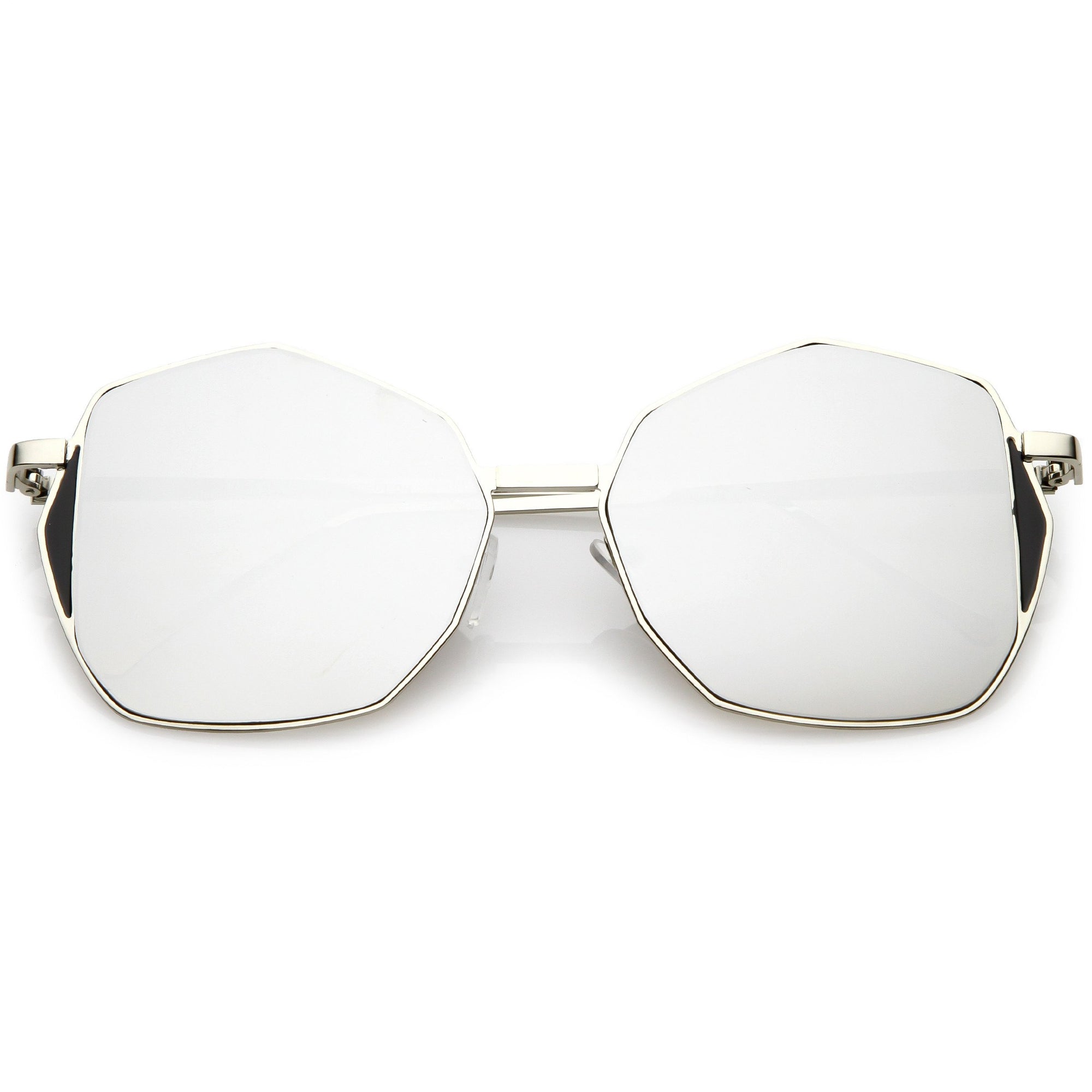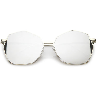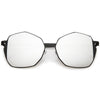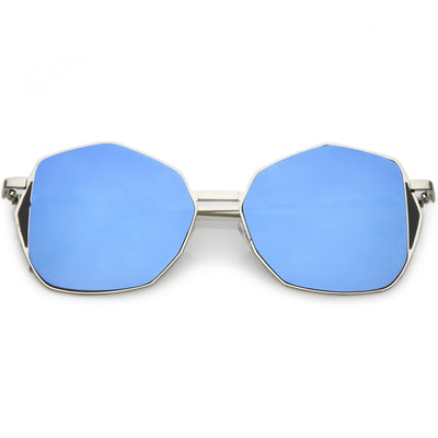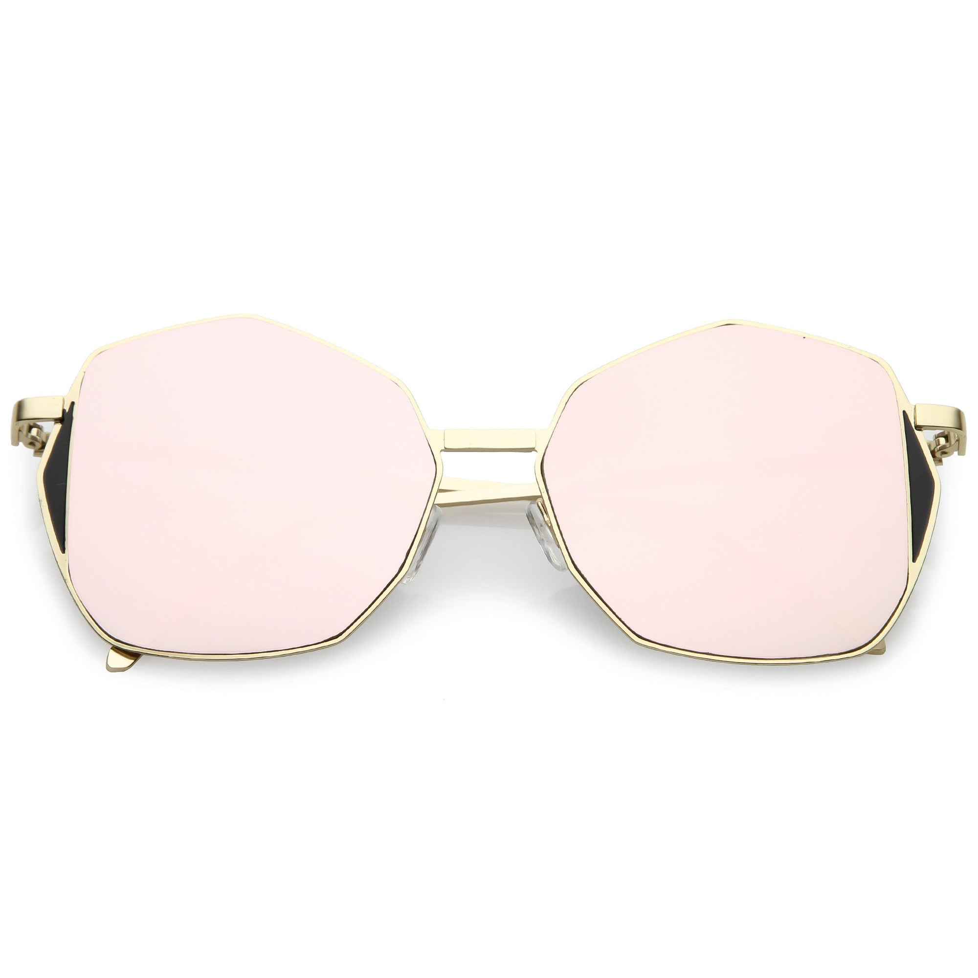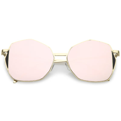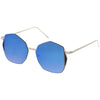 Mix this unique oversize geometric sunglasses in with your everyday go-to accessories. These fun sunglasses are cool and collected but still have a fun side with their color mirrored flat lens and unique side detail. Finished with a metal based frame, slim metal arms, adjustable English style nose pieces, metal hinges, and 100% UV protected lenses.