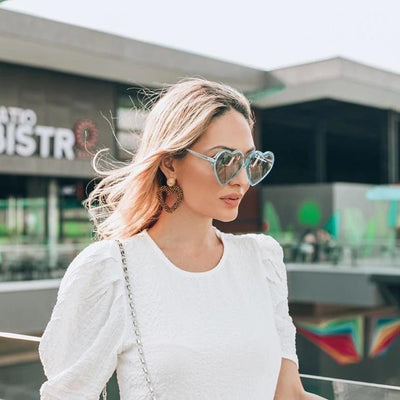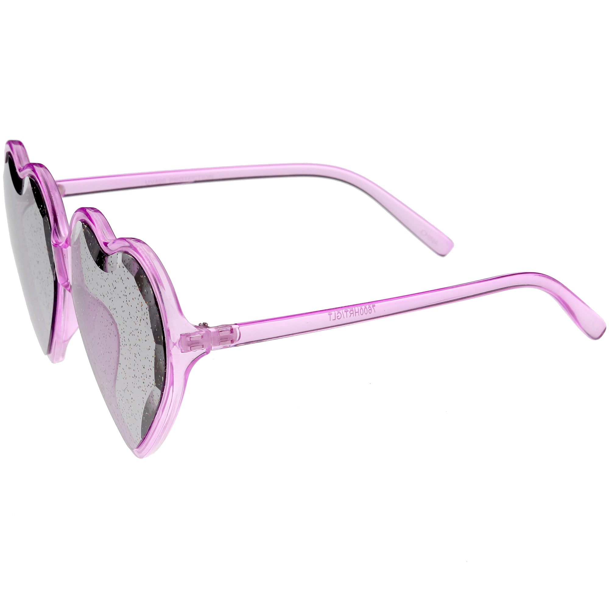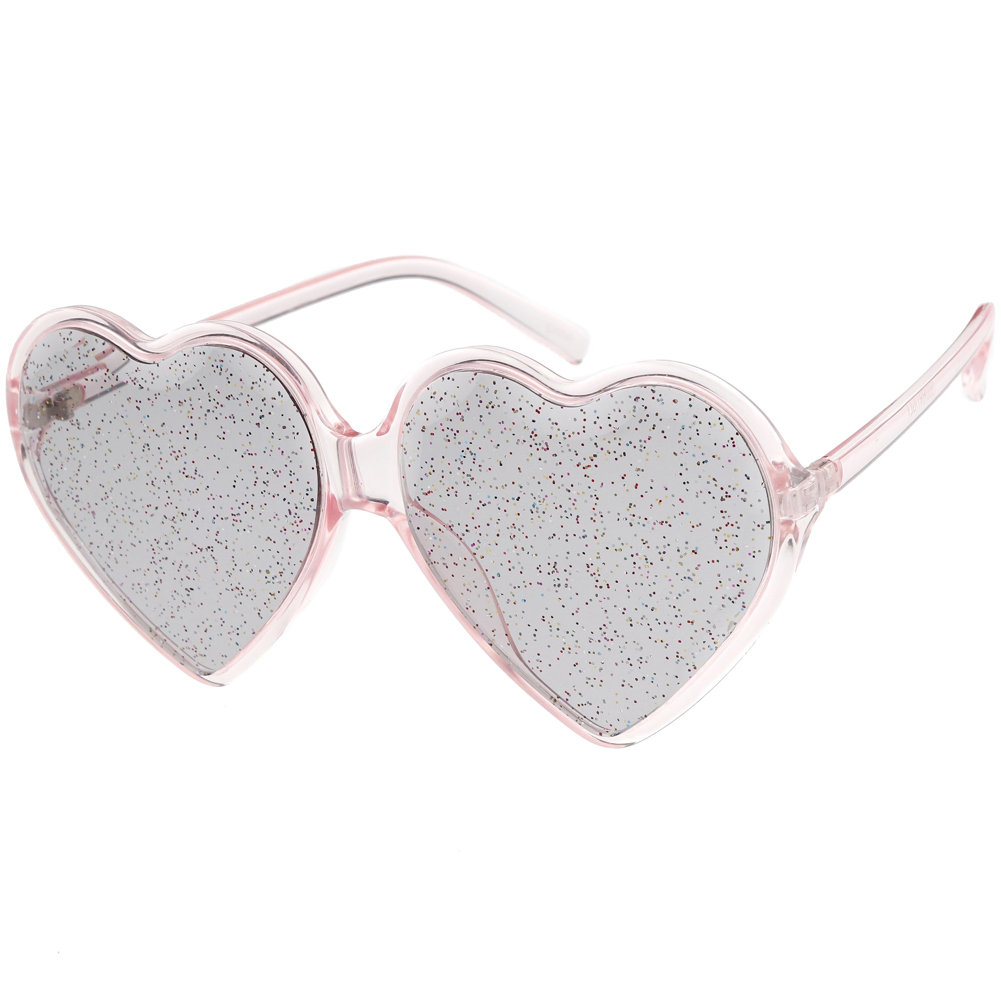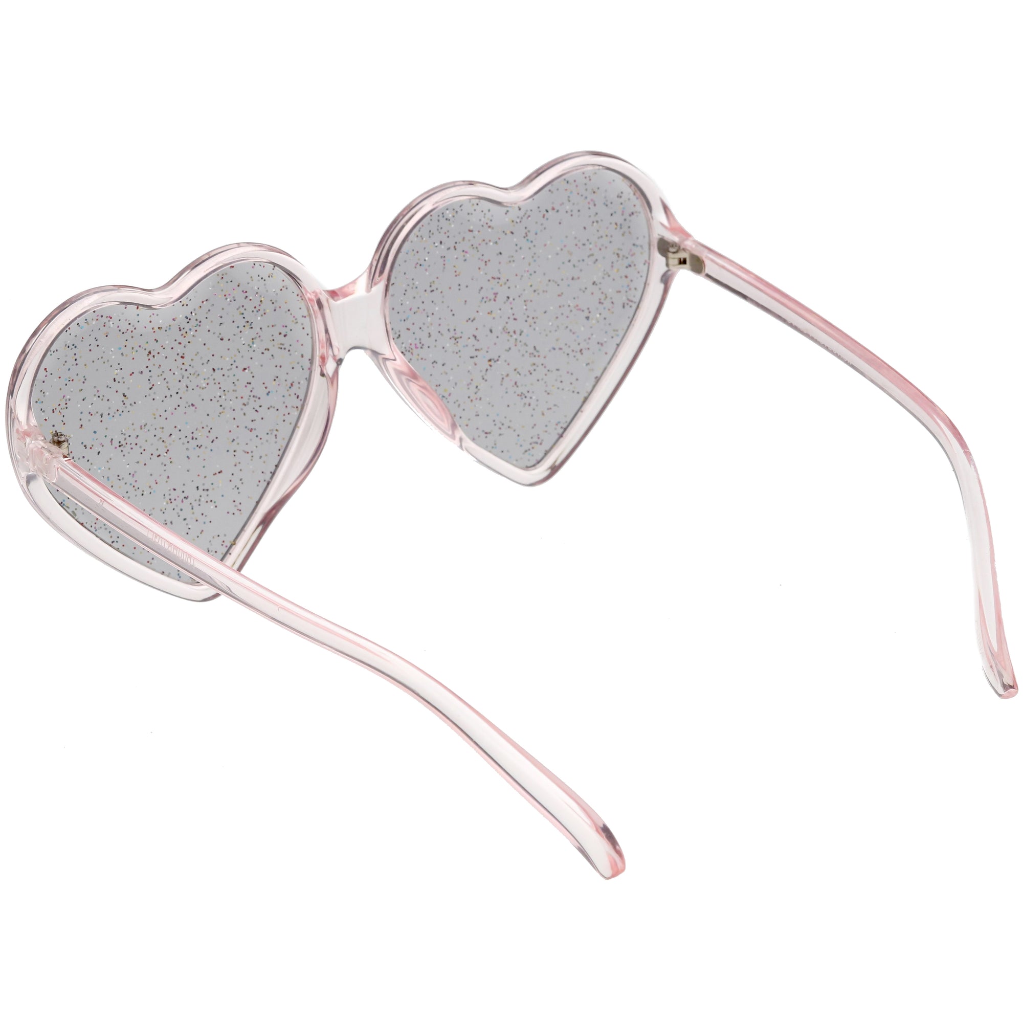 Cute and playful, these novelty heart sunglasses are a party must-have. Designed with an oversize transparent frame and slim arms, these heart sunglasses are accented with smoke tinted glitter lenses. A perfect accessory for photo booths, costumes, or parties, these glitter heart sunglasses add to the fun. Made with a plastic based frame, reinforced metal hinges, and 100% UV protected lenses.