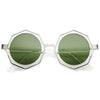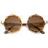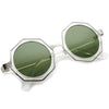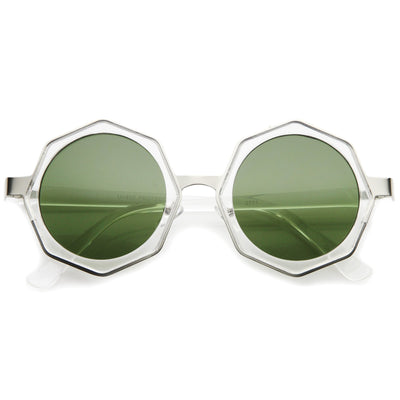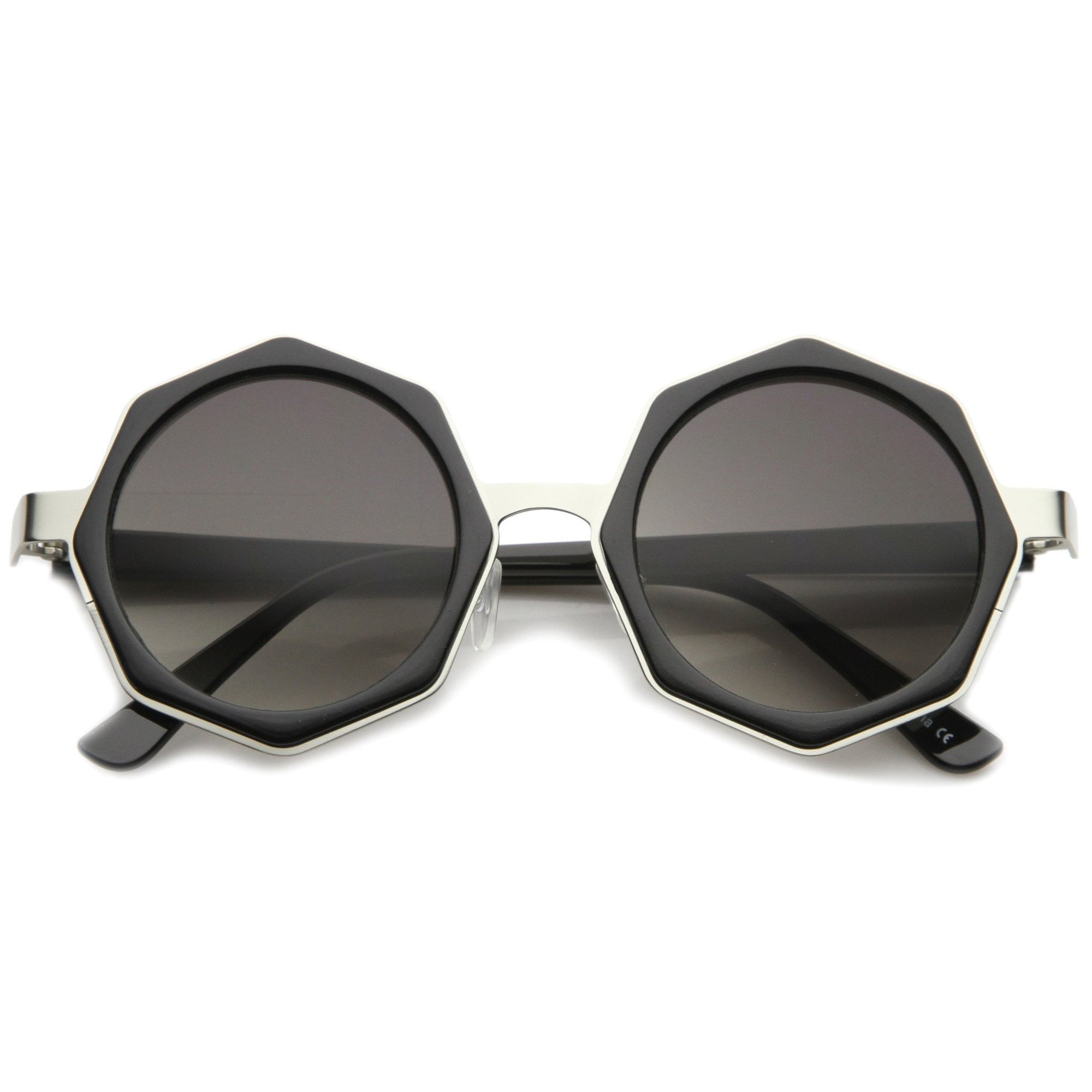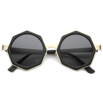 Break away from the traditional square and circle frames with these stunning shades featuring an octagon-shaped design and neutral-hued round flat lenses. Finished with a metal nose bridge and temples, these stylish sunglasses are the perfect combination of glamorous and chic. Made with a plastic and metal based frame, English style nose pieces, reinforced metal hinges, and polycarbonate UV400 lenses.