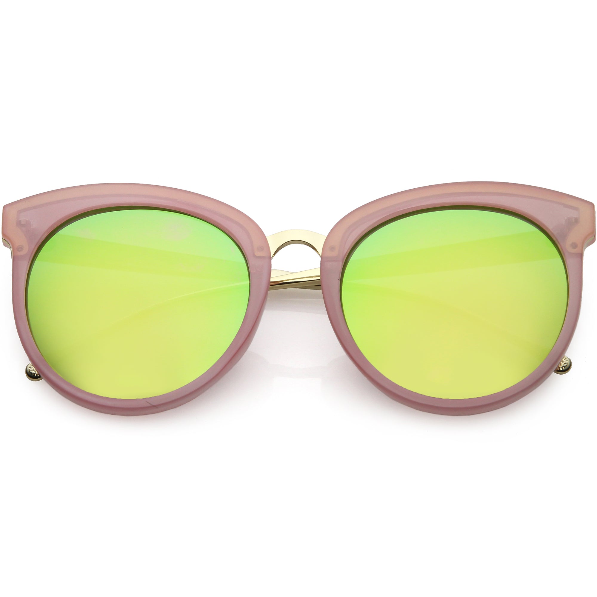 Stylishly chic and versatile, these cat eye sunglasses are designed with an oversize frame and round lenses in neutral colored and mirrored colors for a variety of looks. It slim metal arms, metal trim along the frame, and nose bridge give this style it's luxurious feel. Great for everyday wear, these round cat eye sunglasses are a must-have accessory. Made with a plastic and metal based frame, reinforced metal hinges, and 100% UV protective lenses.