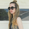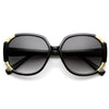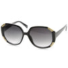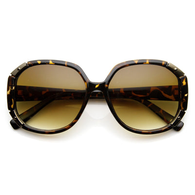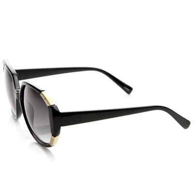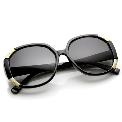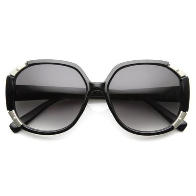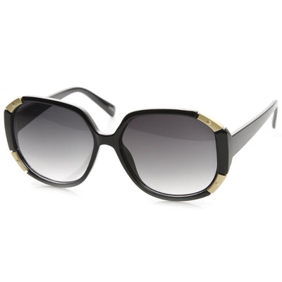 Womens oversized silhouette that features a rounded square frame with metal accent hardware at each corner. These classy oversized sunnies display a subtle elegant look with metal accented corners. Made with a plastic based frame, metal hinges and UV400 protected lens.