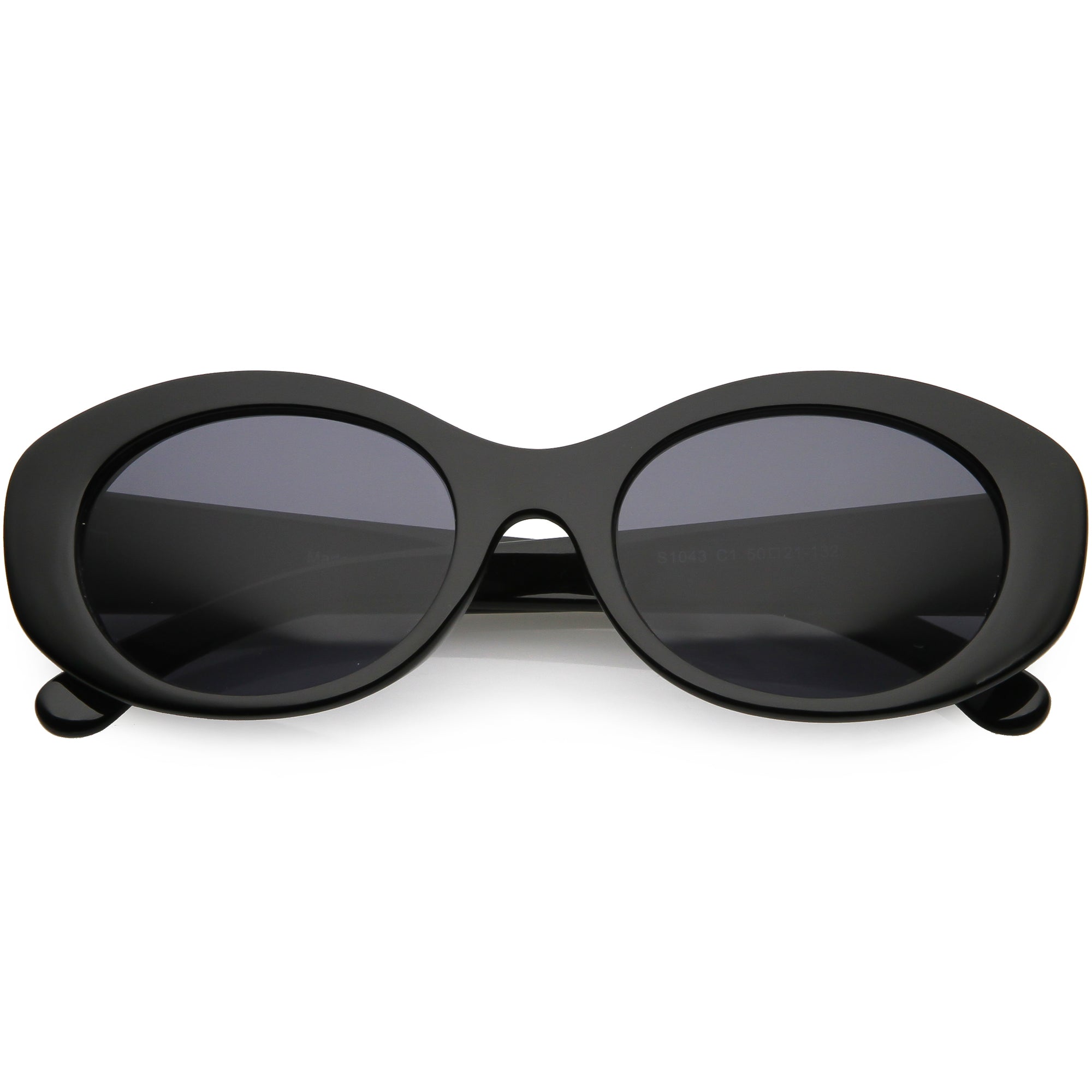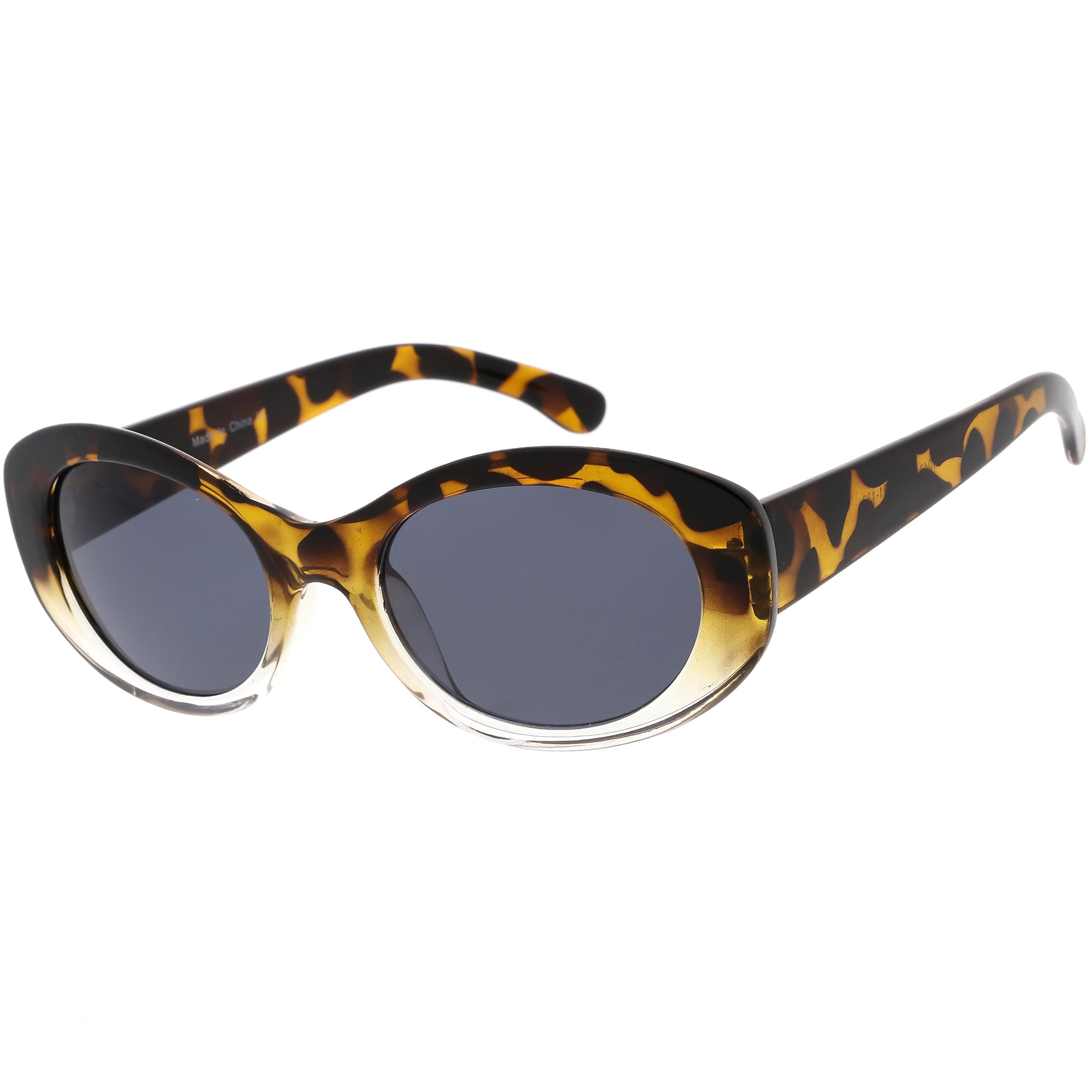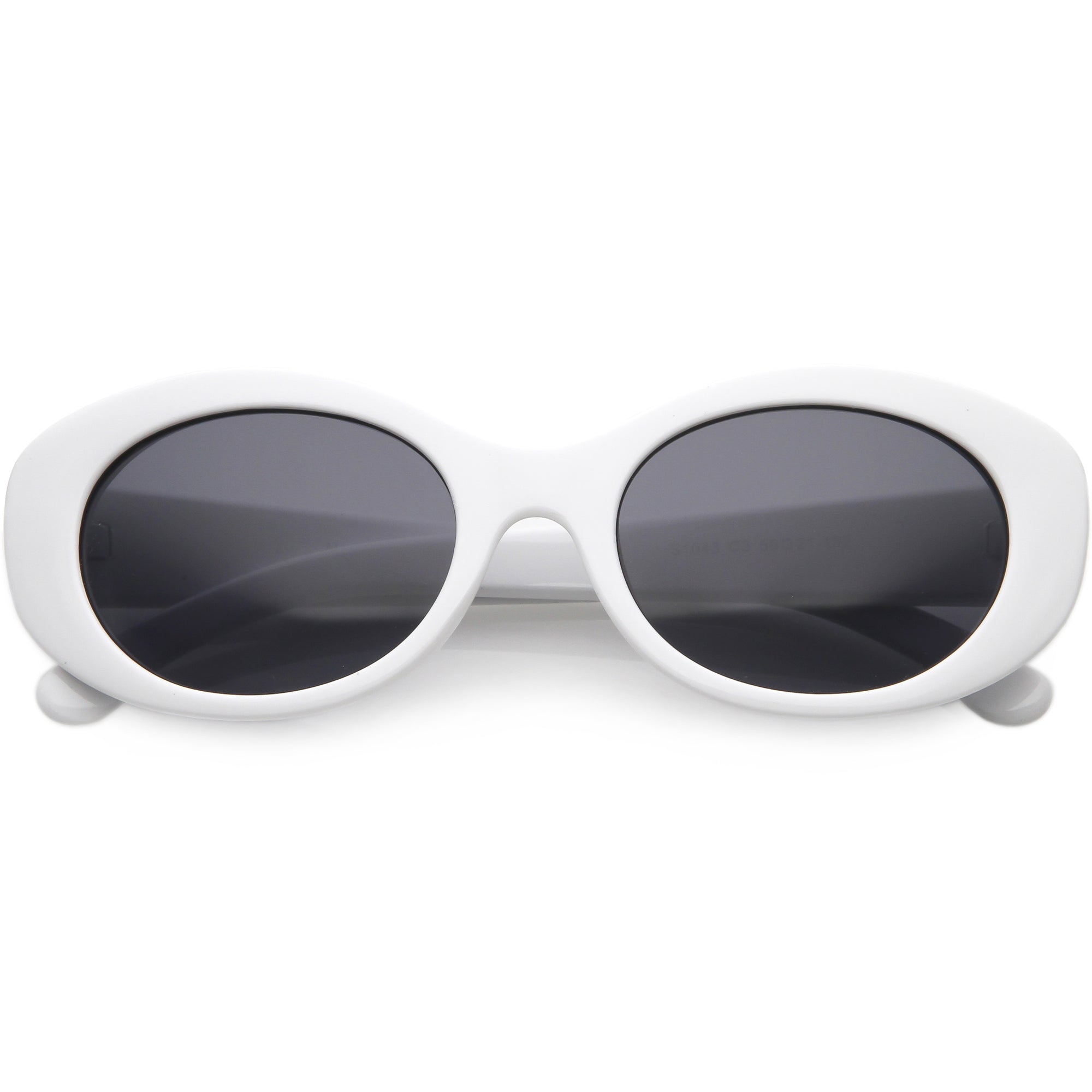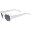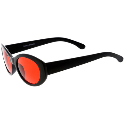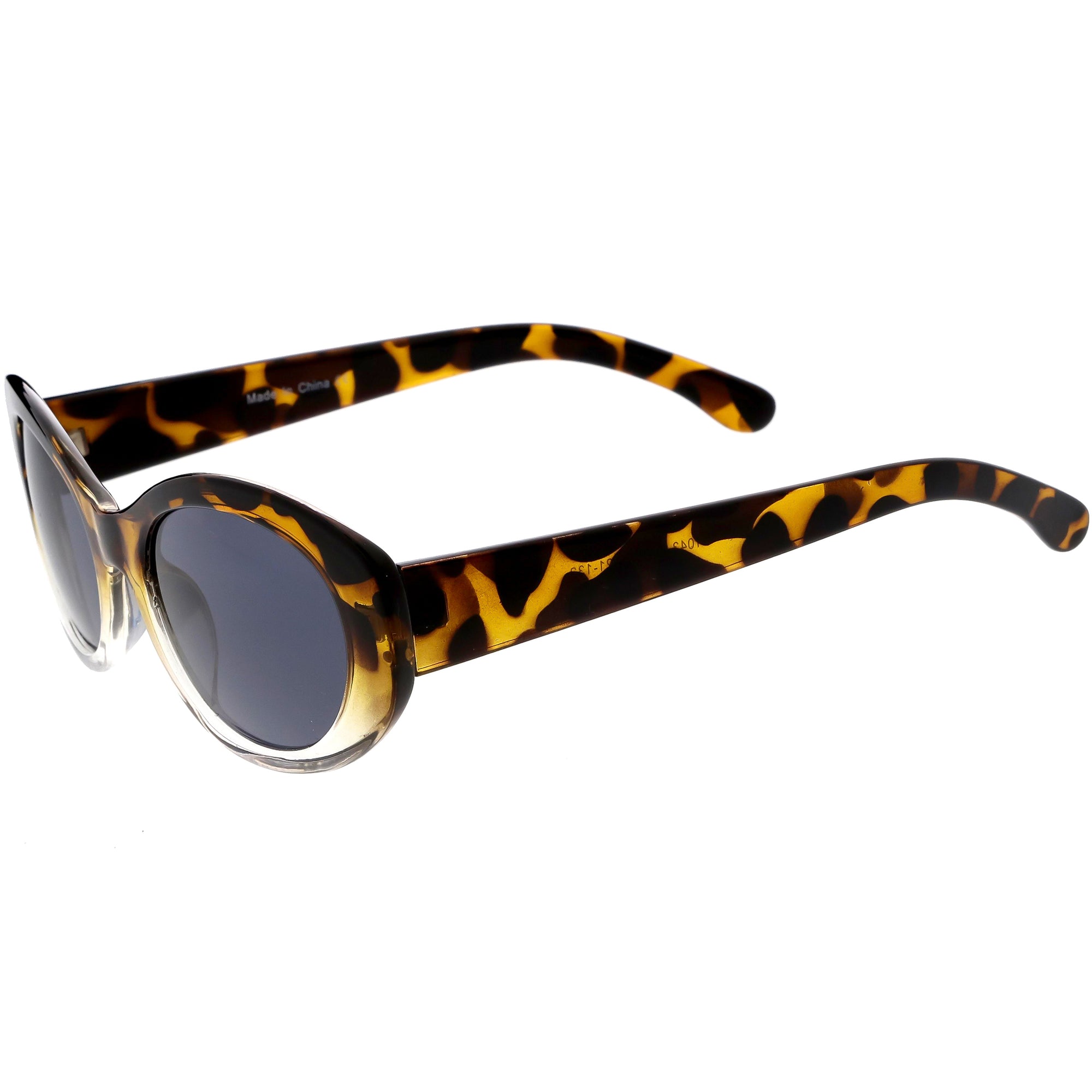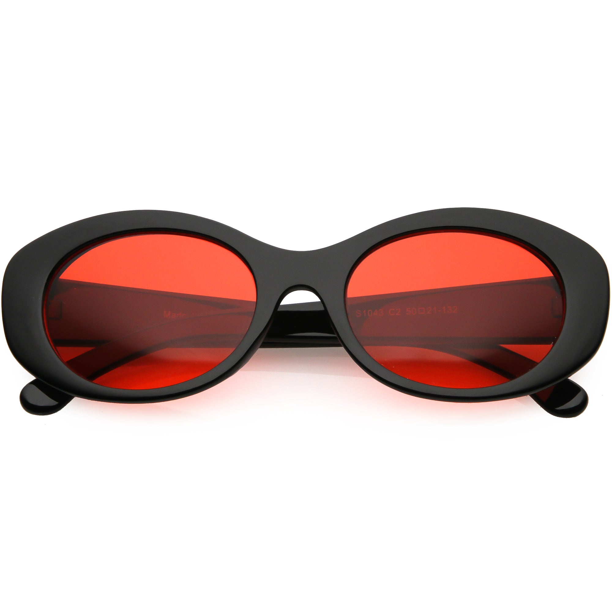 Look retro chic in these oval sunglasses designed with round lenses in neutral colored and color tinted hues. Stylishly wide arms complete this vintage inspired oval sunglasses, making them great for a weekend out with friends. Made with a plastic based frame, reinforced metal hinges, and 100% UV protected lenses.