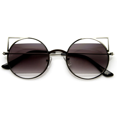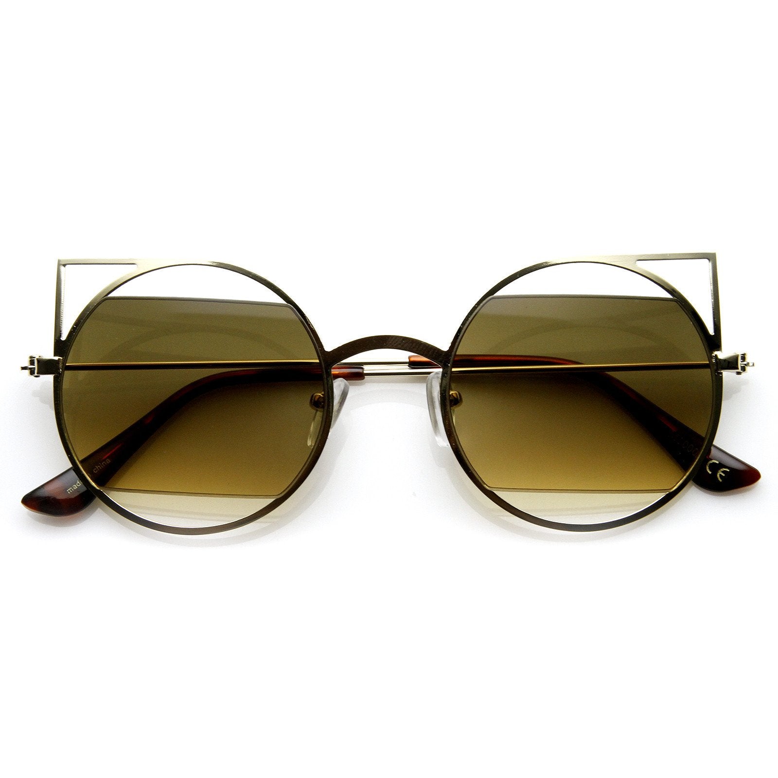 Thin metal cat eye silhouette that features a round cut-out frame inserted with rectangular lenses. Just look at all the neat shapes within this frame! This definitely a very unique piece for this seasons collection. Made with a metal based frame, metal hinges and UV400 protected lens.