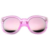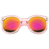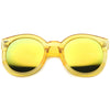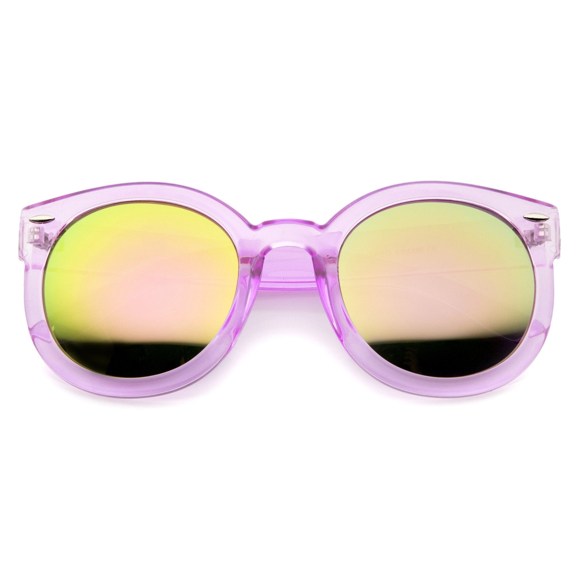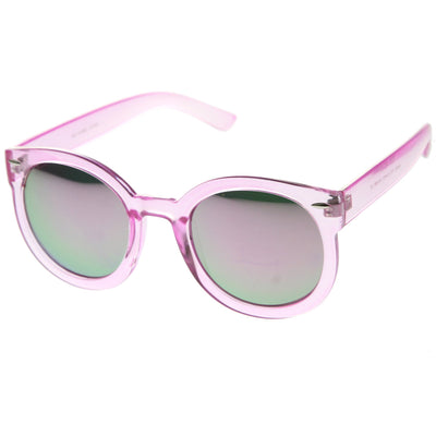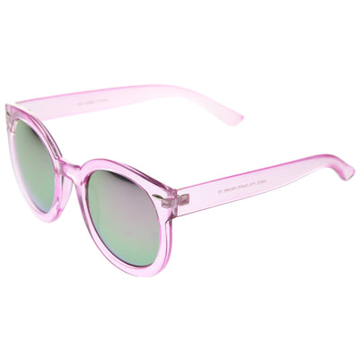 Wonderful for a fun day in the sun, these bold round sunglasses are designed with a colorful transparent frame and reflective colored mirror lenses. Perfected with stylishly wide temples and metal accents at the front, these stunning transparent sunglasses are perfect for adding a pop of color to any eye-catching look. Made with a plastic based frame, reinforced hinges, and reflective UV400 polycarbonate lenses.