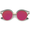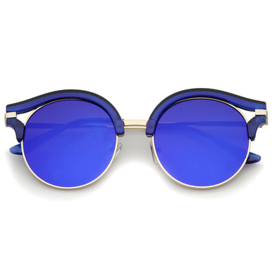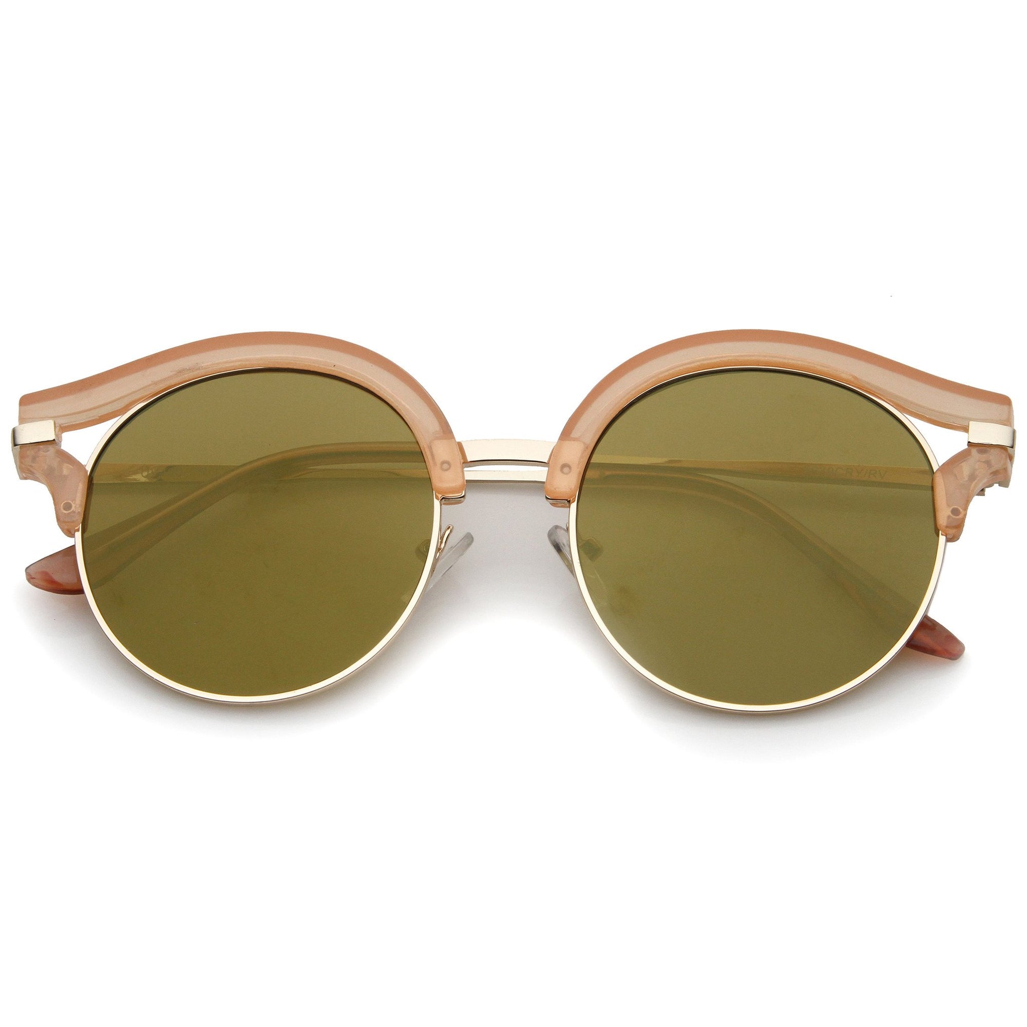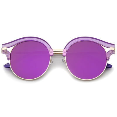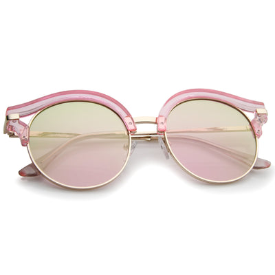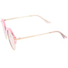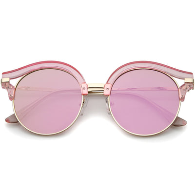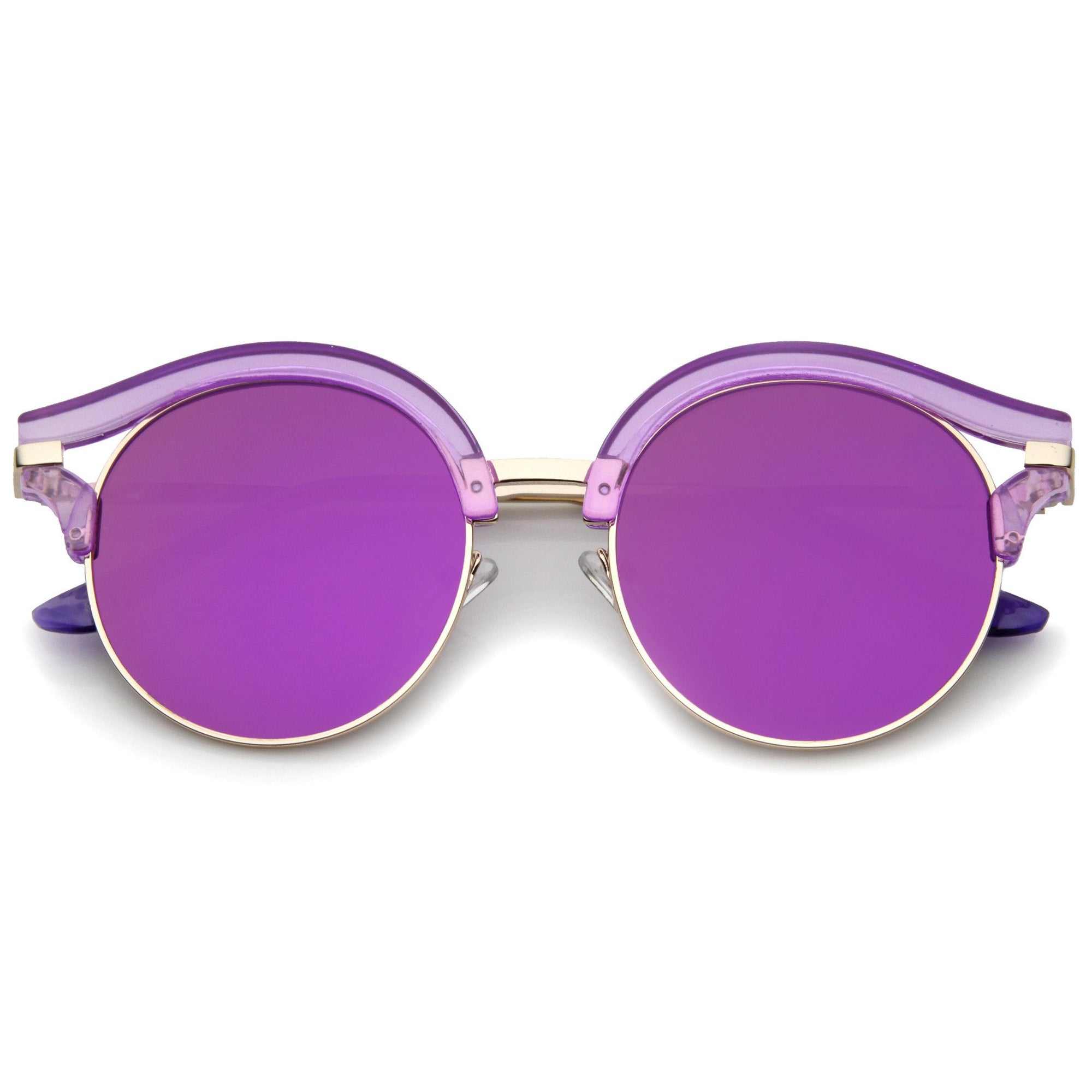 Bold and modern, these flat lens sunglasses feature a transparent half-frame design with unique cutouts at the corners.The slim metal temples and nose bridge add to the style's sleek and sophisticated feel. These exquisitely crafted shades are sure to take any look to the next level with it's variety of fun colors and reflective lenses. Made with a plastic and metal based frame, English style nose pieces, metal hinges, and reflective UV400 lenses.